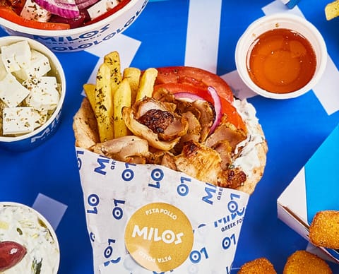 Milos Greek Food unisce il formato dinamico del fast food all'autenticità della cucina greca: gyros pita, souvlaki, insalate greche, tzatziki, moussaka express, yogurt con miele e noci e altre specialità realizzate con ingredienti importati direttamente dalla Grecia. Ogni punto vendita sè caratterizzato da design tradizionale ispirato alle isole greche ma allo stesso tempo innovativo grazie alle tecnologie di cui tutti i negozi sono dotati: totem smart per ordini in loco, delivery veloce e "loyalty program".