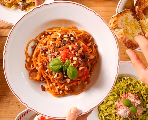 La pasta unisce e rende felici. Prepariamo piatti di pasta fresca per tutti i gusti, dalle ricette italiane più famose ai nostri abbinamenti originali! Se hai voglia di sperimentare, crea il tuo piatto di pasta fresca! Amiamo trovare farine speciali per la nostra pasta, per questo serviamo pasta di legumi, pasta gluten free per intolleranti al glutine e tanto altro. Abbiamo servito i primi Paccheri Tricolore a Milano nel 2017 e da lì non ci siamo più fermati, tanto che adesso la nostra pasta è arrivata a Torino, Bergamo, Pavia, Verona e Padova.